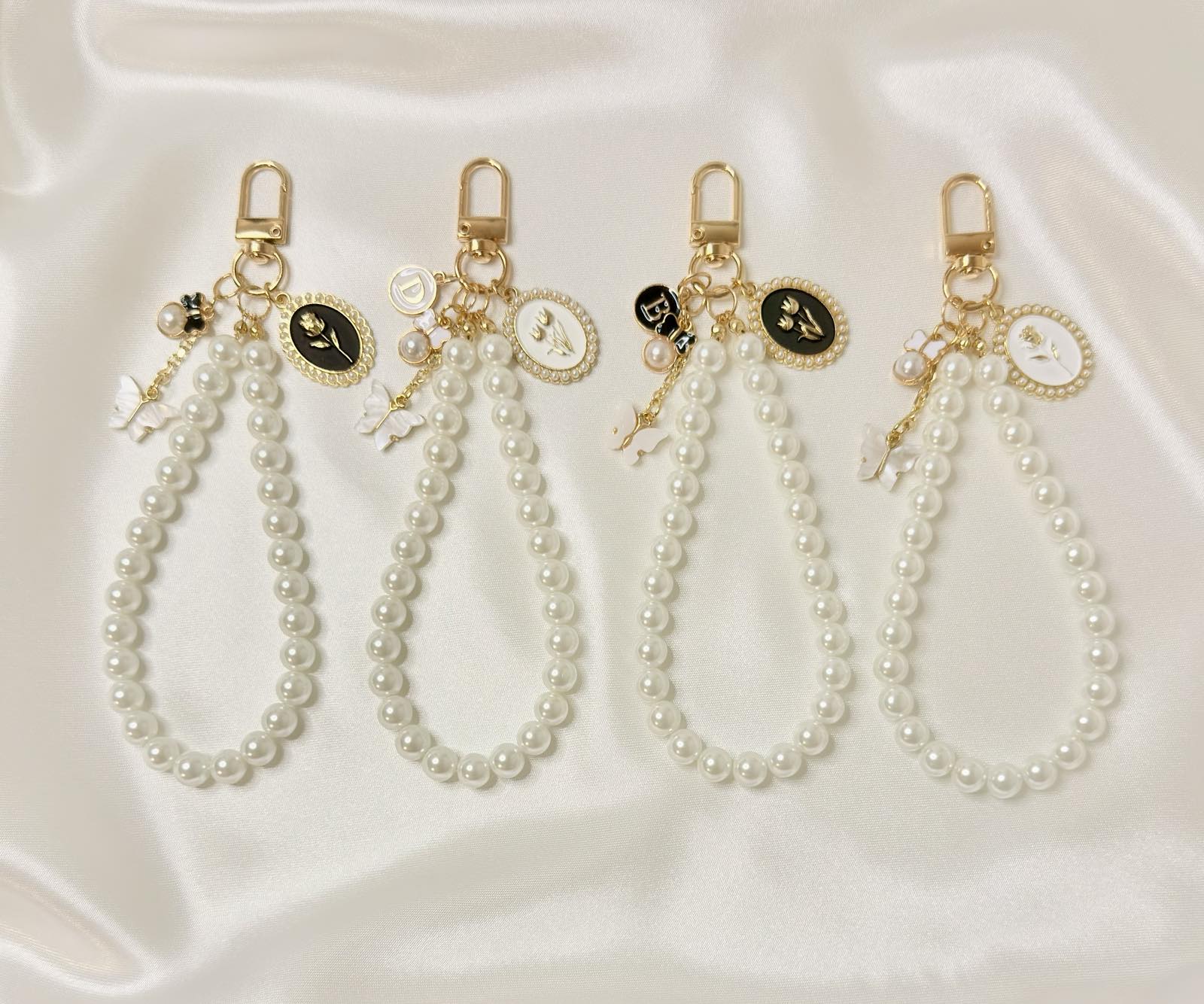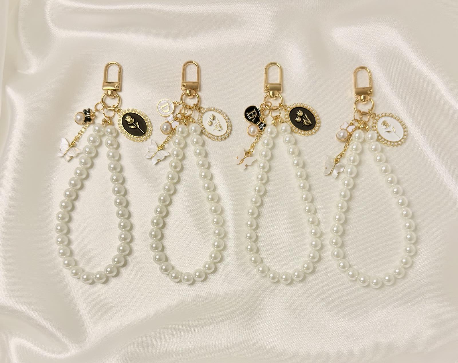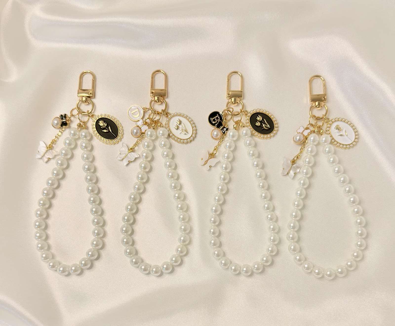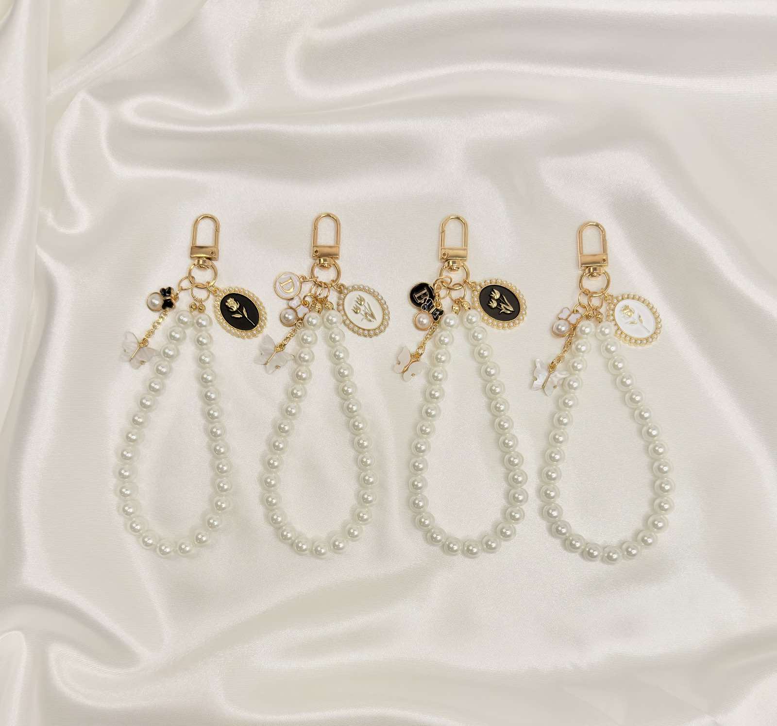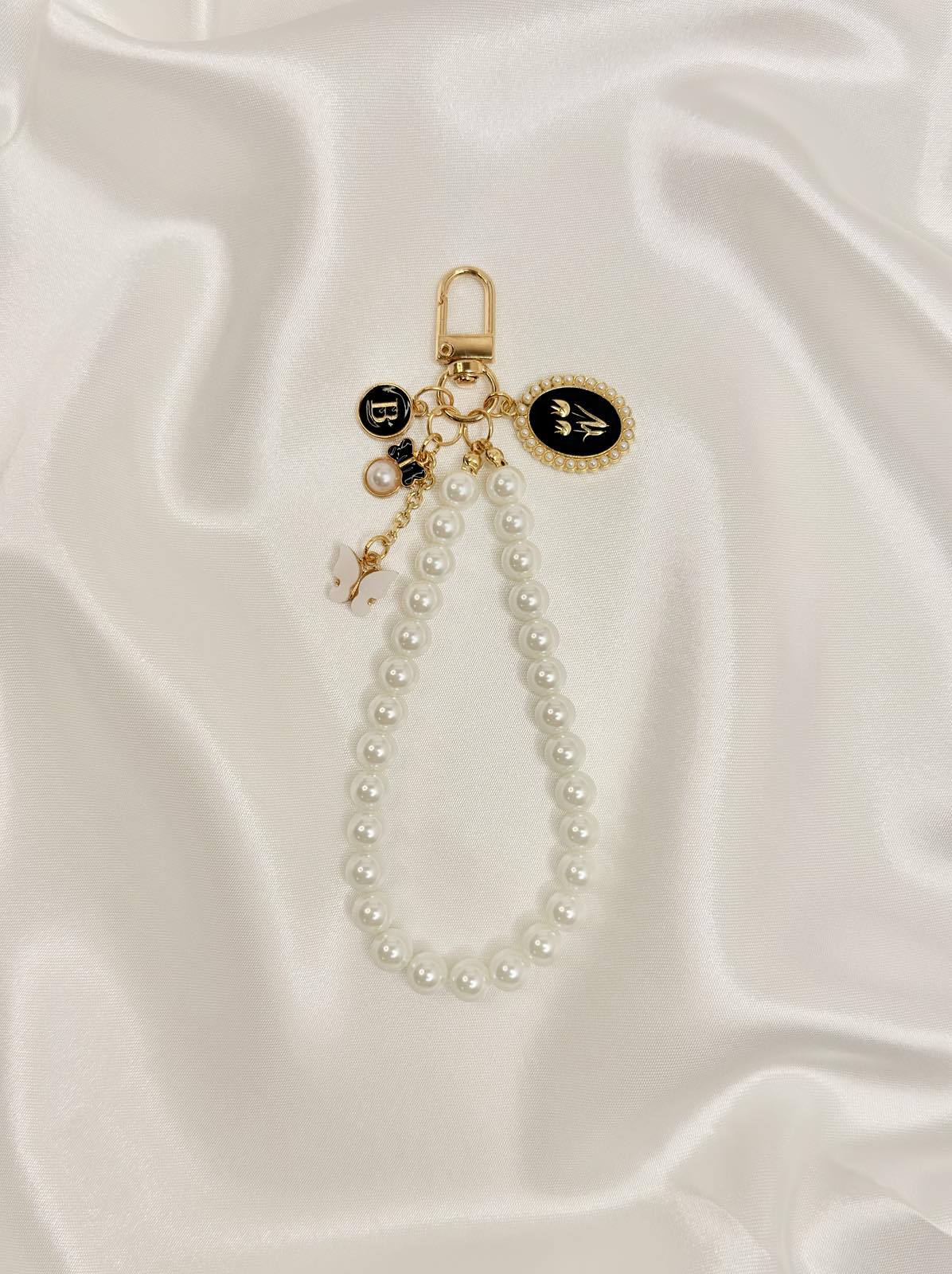 Pearl wristlet made with glossy white beads and gold-tone hardware, finished with a small vintage-style charm cluster. Clips to your phone case, keys or bag so you can carry essentials on your wrist with a simple, elegant touch.