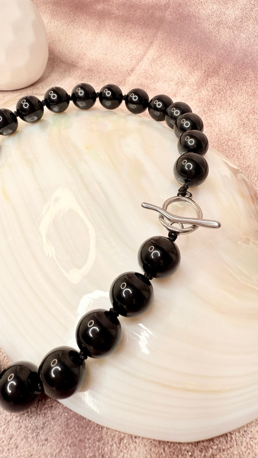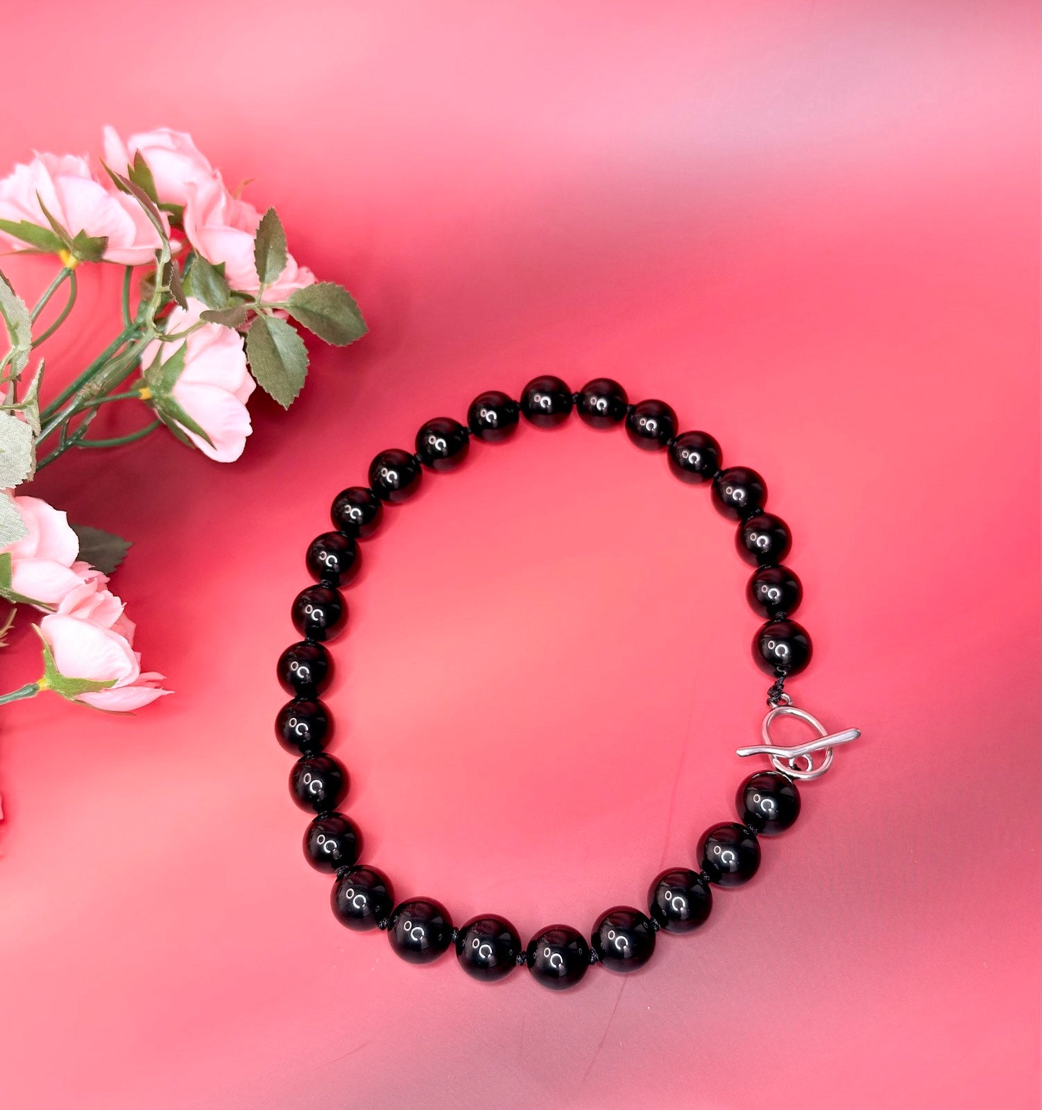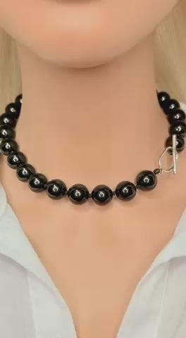 Bold black beaded choker with glossy round 14mm Black Agate beads and a modern toggle you can wear in front or to the side. Each bead is hand-knotted for a luxe feel, and you can choose either gold tone or silver tone hardware to match your style. It’s an easy statement piece that works with a white shirt, blazer, dress or simple tee and makes a gorgeous gift for her.
