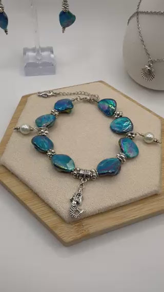 Channel sea‑siren energy with the Ocean Whisper Set, a handcrafted three‑piece matching jewelry collection featuring radiant blue abalone shell, shimmering faux pearls, and silver‑tone accents. Perfect for beach weddings, nautical looks, or a statement gift set.