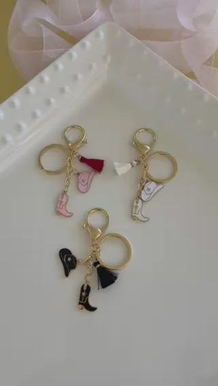 Keychain pendant set includes: cowboy boot, hat, and leather-style tassel charm
