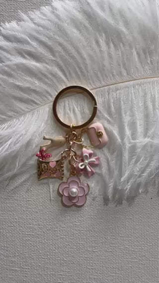 Cute kawaii-style pink charm keychain featuring purse, bow, flower, and “Sweet” charms—perfect gift for best friends, bag lovers, or girly accessories collectors.