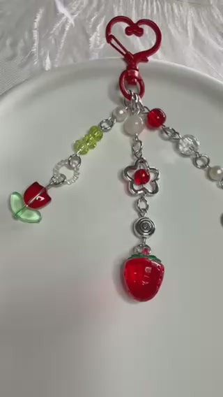 Handmade beaded bag charm with strawberry, tulip & flower motifs